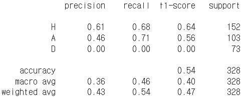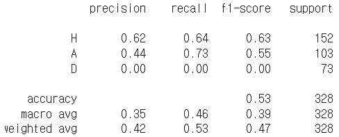 학습 과정에서의 손실(Loss)과 정확도(Accuracy)이다. 학습이 진행될수록 미세하지만 손실이 줄어들고, 정확도는 증가하고 있다. 그러나 에포크가 지나갈수록 그 학습되는 정도가 거의 없어서 에포크는 10번만 설정한 것이다. 또한 정확도를 보면 훈련 정확도와 validation 정확도가 거의 차이가 나지 않는 것으로 보아 과적합의 우려는 적은 것으로 보인다. 테스트 손실과 정확도는 다음과 같았다 - Test Loss: 0.9834573268890381, Test Accuracy: 0.5304877758026123. 이때 홈 승리, 어웨이 승리, 무승부 각각의 클래스별로 데이터 개수가 다르므로 f1-score 등 다양한 지표도 출력해 보았다.