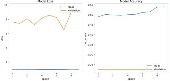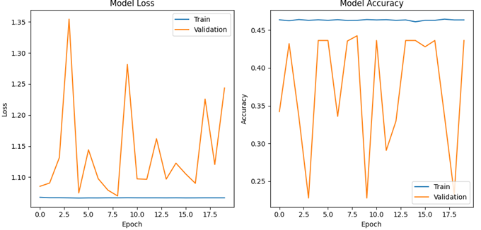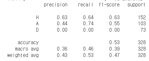 훈련 과정에서의 손실 값 감소와 정확도 증가를 나타내는 그래프이다. LSTM보다 좀 더 울퉁불퉁하게 학습이 진행되었음을 알 수 있었다. 이 모델 역시 훈련 정확도와 validation 정확도의 차이가 적은 편이다. 테스트 손실 및 정확도는 다음과 같았다. - Test Loss: 0.9831950664520264, Test Accuracy: 0.5365853905677795. 이 모델 역시 f1-score 등 다양한 지표를 출력해 보았다.