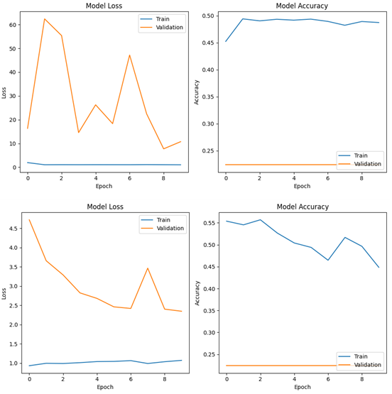 위에서부터 각각 선행 연구에서의 모델, 단순 RNN, LSTM 모델이다. 드롭아웃 계층을 적용시켰음에도 불구하고 과적합이 심하게 된 모습이다. 결국 실제 테스트 정확도도 세 개의 모두 모두 비슷하게 약 31% 정도로 매우 낮았다.