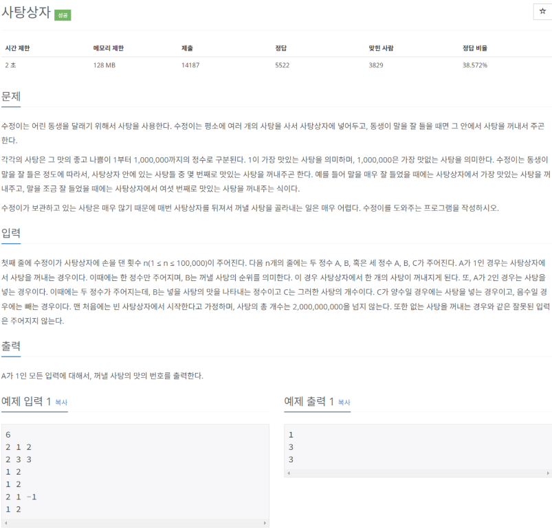 첫째 줄에 수정이가 사탕상자에 손을 댄 횟수 n(1 ≤ n ≤ 100,000)이 주어진다. 다음 n개의 줄에는 두 정수 A, B, 혹은 세 정수 A, B, C가 주어진다. A가 1인 경우는 사탕상자에서 사탕을 꺼내는 경우이
