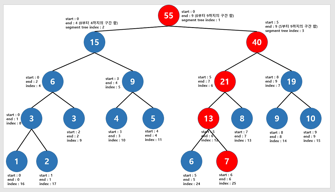 먼저 루트 노드부터 보자. 세그먼트 트리의 루트 노드에는 0번째부터 9번째 인덱스까지의 구간 합이 들어가고 루트 노드는 1번 인덱스가 된다. 루트 노드의 왼쪽 자식 노드의 번호는 2번이 되며, 0번 인덱스에서 (0+9)//2번 인덱스, 즉 0~4번 인덱스까지의 구간 합이 삽입된다. 오른쪽 자식 노드의 번호는 3번이 되며, (0+9)//2+`번 인덱스에서 끝까지, 즉 5~9번 인덱스까지의 구간 합이 삽입된다. 이러한 방식으로 시작 인덱스와 끝 인덱스가 같아질 때까지 세그먼트 트리의 원소를 채워주게 된다. 이때 보통 리스트의 인덱스는 0번부터 시작하는데, 세그먼트 트리는 왜 1번부터 시작할까? 그 이유는 세그먼트 트리를 재귀적으로 편하게 생성하기 위해서이다. 특정 노드의 인덱스가 n이라면 2*n 번째 노드는 왼쪽 자식 노드를 가리키고, 2*n+1 번째 노드는 오른쪽 자식 노드를 가리키게 되어 효과적이기 때문이다. 세그먼트 트리는 두 자식 노드 값의 합이 루트 노드가 된다는 특징이 있다. 한편 세그먼트 트리를 생성할 때는 보통 리스트의 길이에 4를 곱한 크기로 생성하는데, 엄밀히 따지면 리스트의 길이가 N일 때 N보다 큰 가장 가까운 제곱수를 구한 뒤에 그것의 2배를 하여 크기를 만들어야하나 넉넉하게 트리를 생성하는 것이다. 따라서 세그먼트 트리를 생성하고 그 값을 채워주는 코드는 다음과 같다.