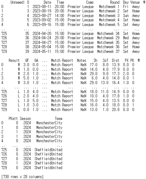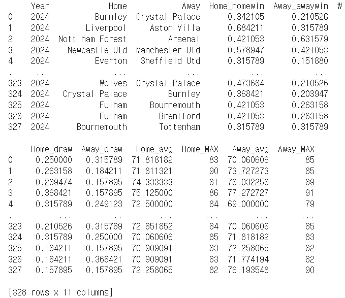 다음으로 테스트 데이터셋을 만들어보았다. 테스트 데이터셋에 사용될 승률과 평점은 각각 2023년에 계산된 승률과 FIFA24를 바탕으로 계산된 평점을 사용하면 되었으나 2024년의 경기의 결과를 아직 계산하지 않았다는 문제가 있었다. 따라서 마침 2024년의 프리미어리그 경기 일정이 몇 주 전에 종료되었기 때문에 이 경기 결과를 정리한 데이터셋을 수집한 뒤, 전처리를 거치기로 했다. 먼저 이렇게 수집한 데이터를 출력하면 다음과 같다.