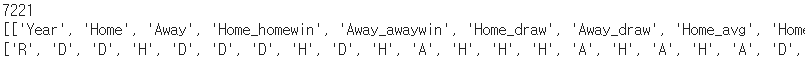 이다. 각각의 feature의 의미를 순서대로 설명하면 (경기가 치뤄진 년도), (홈 팀), (어웨이 팀), (홈 팀의 홈 승률), (어웨이 팀의 어웨이 승률), (홈 팀의 무승부 확률), (어웨이 팀의 무승부 확률), (홈 팀의 평균 FIFA 평점), (홈 팀의 최대 FIFA 평점), (어웨이 팀의 평균 FIFA 평점), (어웨이 팀의 최대 FIFA 평점) 이다. training data의 training label의 칼럼은 'R'(Result-경기 결과) 하나이고, 이는 'D'(무승부), 'H'(홈 팀 승리), 'A'(어웨이 팀 승리) 3개 중 하나로 구성된다. 이를 고려해서 각각의 training data와 training label을 만들어보면 다음과 같다.