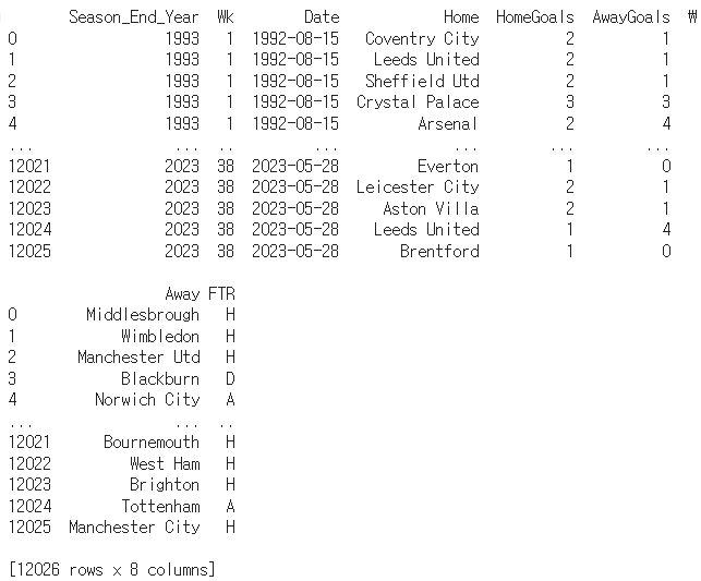 먼저 1993~2023년까지의 프리미어리그 경기 결과 데이터셋을 불러와서 그 형태를 확인해보았다.