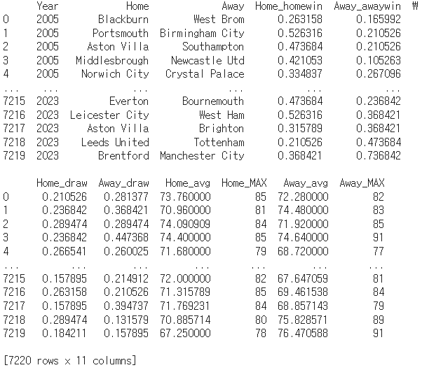 앞서 수집하여 만든 2개의 CSV과 각각의 경기 결과 데이터셋을 바탕으로 최종 training dataset과 test dataset을 만들어 보았다. 먼저, 각각의 training data와 test data의 칼럼은 'Year','Home','Away','Home_homewin','Away_awaywin','Home_draw','Away_draw','Home_avg','Home_MAX','Away_avg','Away_MAX'