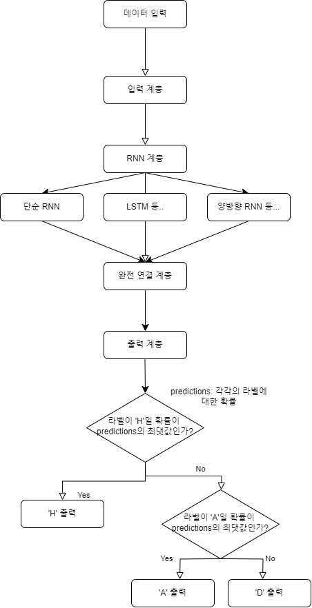 내가 개발할 인공지능의 알고리즘은 간단하게 "입력 → 모델 → 출력"으로 표시할 수 있다. 이때 입력 데이터는 [ 'Year','Home','Away','Home_homewin','Away_awaywin','Home_draw','Away_draw','Home_avg','Home_MAX','Away_avg','Away_MAX' ]의 feature를 가진 위에서 전처리한 데이터이다. 본 데이터는 시계열 데이터이므로 모델으로는 RNN 기반 모델(RNN, LSTM 등)을 사용할 것이다. 출력 데이터는 각각의 경기의 결과 'R' 만 출력하면 된다.
