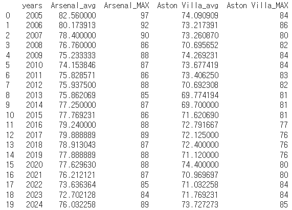 출력 결과는 아래와 같았다. 총 팀 수는 50팀이었으며, 총 년도는 1993~2023년까지 31년이었다.