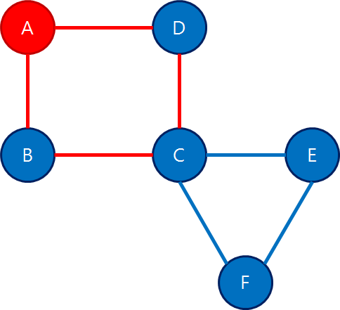 위 그래프의 빨간 선처럼 시작점을 A로 놓고 경로 [A, B, C, D, A]를 찾았다고 하자. 그러나 이 중 정점 C는 아직 방문하지 않은 인접한 간선이 존재한다.